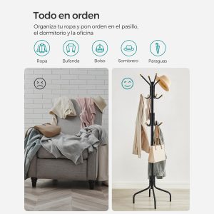 Más allá de simplemente colgar ropa, este perchero está diseñado para organizar tus bufandas, sombreros, bolsos y paraguas, manteniéndolos ordenados y siempre al alcance de la mano. Su diseño multiuso lo convierte en la solución perfecta para el vestíbulo, el dormitorio o la oficina, añadiendo funcionalidad sin sacrificar estilo.