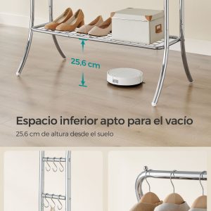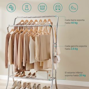 Multifuncionalidad: Ofrece una solución de almacenamiento todo en uno con barras de altura variable para ropa de distintas longitudes, ganchos para accesorios y un estante inferior para zapatos y cajas.