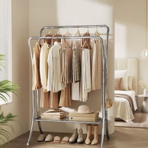 Este multifuncional perchero está diseñado para proporcionar una solución de almacenamiento eficiente y estilizada para tu ropa, bolsos, sombreros y zapatos. Con su estructura robusta y resistente fabricada en tubos de acero de 25,4 mm de diámetro, este perchero asegura la durabilidad y estabilidad necesarias para sostener hasta 115 kg de carga. Su diseño de doble barra maximiza el espacio de almacenamiento, permitiendo colgar aproximadamente 70 piezas de ropa de diferentes longitudes sin amontonarlas, mientras que los 6 ganchos adicionales y el estante inferior ofrecen opciones de almacenamiento extra para accesorios y calzado.