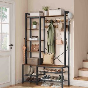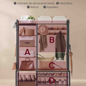 Multifuncional 4 en 1: Combina perchas, banco, zapatero y estante de almacenamiento para un uso versátil.