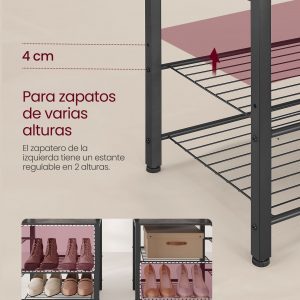 Zapatero con 2 Estantes: Los 2 estantes de metal en la parte inferior pueden acomodar 13-14 pares de zapatos, con un estante de altura ajustable para adaptarse a diferentes tamaños.