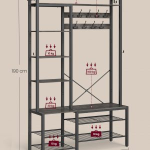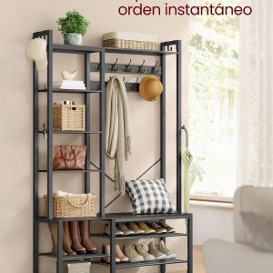 Este completo perchero ofrece una solución todo en uno para tu pasillo, combinando perchas, banco, zapatero y estante de almacenamiento. Con su diseño elegante y organizado, aprovecha al máximo tu espacio y crea un área funcional y ordenada.