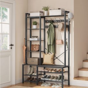 Multifuncional 4 en 1: Combina perchas, banco, zapatero y estante de almacenamiento para un uso versátil.