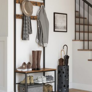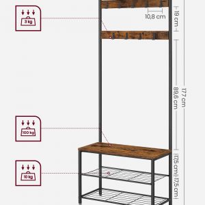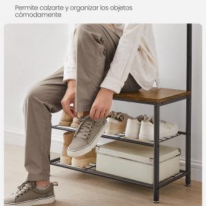 El banco debajo del perchero permite sentarte cómoda y tranquilamente gracias al tablero de aglomerado con capacidad para 100 kg. También puedes utilizarlo para organizar cajas de zapatos y almacenaje, plantas o decoraciones.