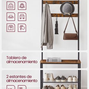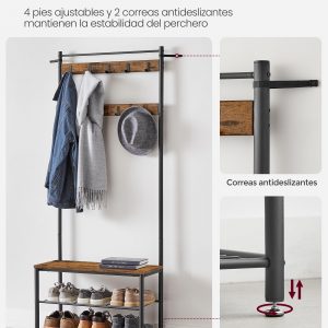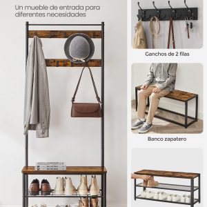 Este mueble recibidor combina ganchos, banco y estantes zapatero, para satisfacer tus necesidades de organizar la ropa y los objetos y permitirte sentarte y ponerte los zapatos cómodamente.