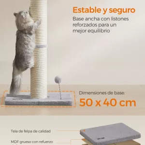 Base Reforzada para Mayor Estabilidad: La base de 50 x 40 cm está reforzada con listones de MDF, lo que garantiza una gran estabilidad mientras tu gato rasca, juega o trepa. Es lo suficientemente resistente para soportar el entusiasmo de cualquier felino sin riesgo de caídas.