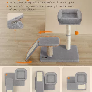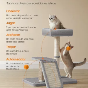 Diversión Completa: Incluye una cama suave para que tu gato descanse, una rampa ajustable para trepar, una tabla para rascar, dos pompones para jugar y un auto-aseador para su comodidad.