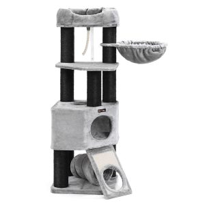 Zona de Juego en la Planta Baja para Máxima Diversión: Además de los cómodos espacios en las zonas superiores, este árbol cuenta con un amplio patio de juegos en la planta baja. Equipado con un rascador y un túnel, es el área ideal para que tu gato se divierta y ejercite.