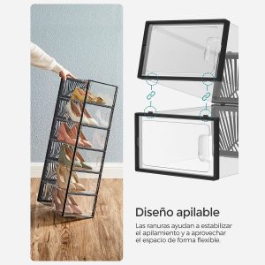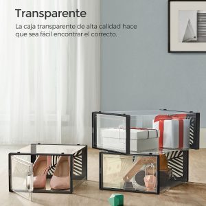 Multiusos: Más allá de guardar zapatos, estas cajas son perfectas para organizar ropa, papelería y accesorios. Su diseño transparente las hace ideales también para exhibir tus objetos favoritos.