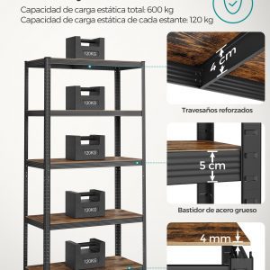 Color: Marrón Rústico, Negro Material: Marco de Acero, Tablero de Aglomerado Dimensiones de cada producto: 30 x 75 x 150 cm (Profundo x Ancho x Alto)Peso de cada producto: 9,1 kg Max. capacidad de carga estática de cada estante: 130 kg Max. capacidad de carga estática total de cada producto: 650 kg
