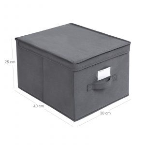 Especificaciones: Color: Gris Material: 80 g/㎡ Tela No Tejida, Cartón de 2 mm de Espesor Dimensiones del Producto: 40 x 30 x 25 cm (Largo x Ancho x Alto)Peso del Producto: 2,3 kg Max. Capacidad de Carga Estática de Cada Caja: 5 kg