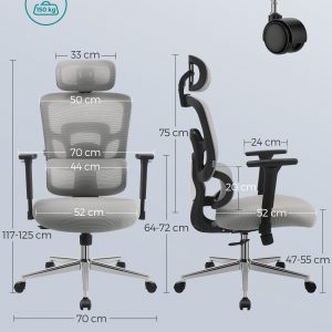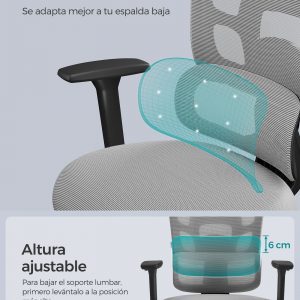 Esta silla de oficina ergonómica está diseñada para ofrecerte el máximo confort y adaptabilidad mientras trabajas. Con una serie de ajustes personalizables, esta silla se adapta perfectamente a tus necesidades específicas, asegurando un soporte óptimo durante las largas horas de trabajo. Disfruta de un soporte lumbar independiente que se ajusta 6,1 cm hacia arriba o hacia abajo, un respaldo que se reclina en tres ángulos diferentes, y un reposacabezas que se ajusta tanto en altura como en ángulo.