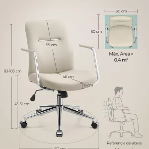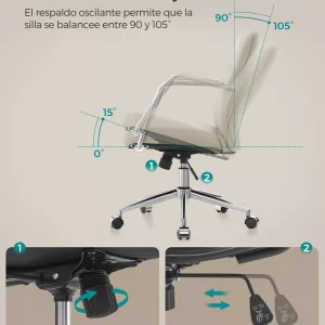 Ajustes Múltiples: Esta silla ofrece versatilidad en su uso, con ajuste de altura de 43 a 51 cm y la capacidad de inclinar el respaldo entre 90° y 105°, además de rotación de 360 grados, proporcionando flexibilidad para cada tarea.