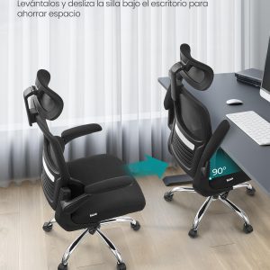 Ahorro de Espacio y Versatilidad: Los reposabrazos se pliegan a 90 grados permitiendo que la silla se deslice fácilmente bajo el escritorio, optimizando el espacio en tu oficina o casa.