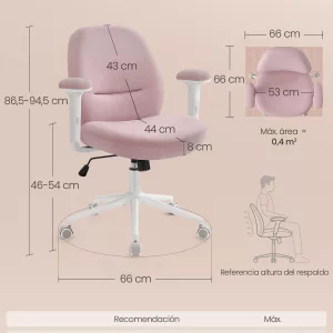 Buen apoyo y comodidad: Equipado con un acolchado de espuma de alta resiliencia y un respaldo de 43 cm de altura que proporciona un soporte eficaz. El asiento curvado de 8 cm distribuye la presión de manera uniforme, mientras que los reposabrazos acolchados y ajustables ofrecen un soporte adicional para los brazos.