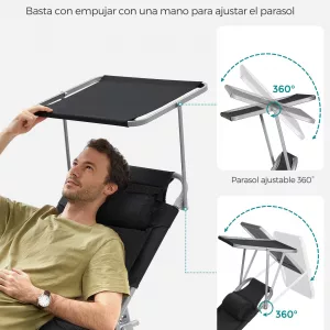Sombrilla Ajustable: Incluye una sombrilla regulable que puedes ajustar fácilmente con la mano para bloquear el sol y leer o relajarte sin deslumbrarte. La sombra adicional permite una experiencia más cómoda bajo el sol.