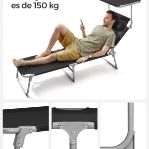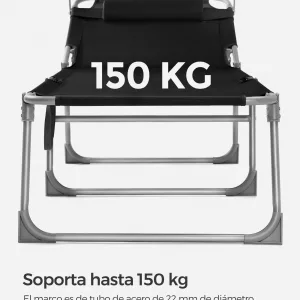 Estabilidad y Durabilidad: Su marco de acero con recubrimiento de polvo y juntas reforzadas soportan hasta 150 kg. Los pies antideslizantes proporcionan mayor estabilidad, asegurando que la tumbona se mantenga firme en todo momento.