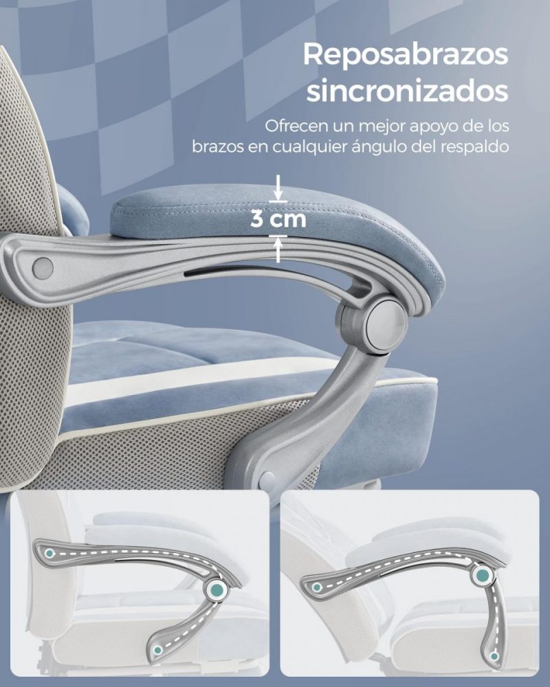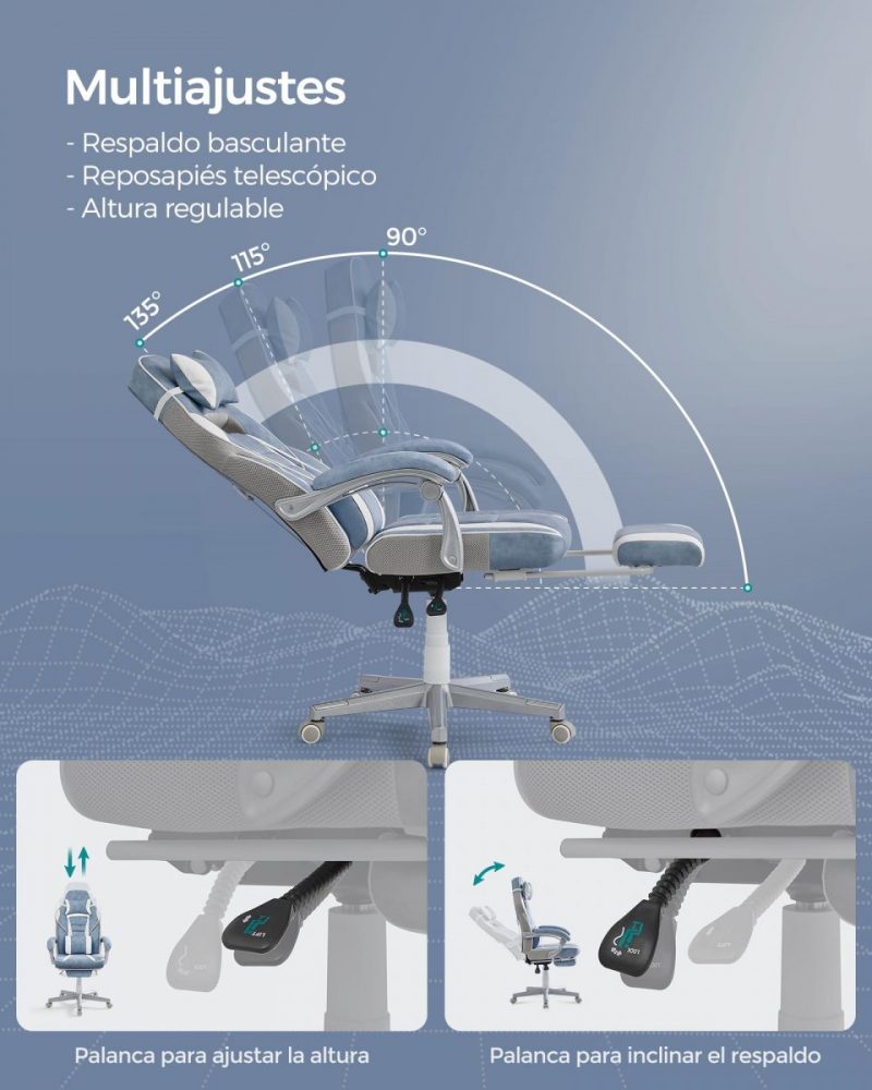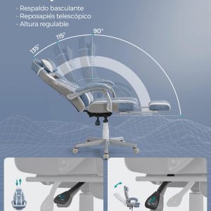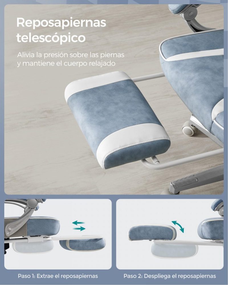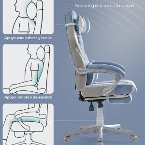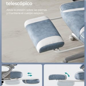 Equipada con reposacabezas y soporte lumbar, esta silla promueve una postura saludable mientras trabajas. Además, con un reposapiés retráctil y un respaldo inclinable, puedes tomar breves momentos para recostarte, estirar y relajar tu cuerpo, asegurando que tu mente permanezca enfocada y libre de distracciones. Las ruedas de nailon garantizan un desplazamiento suave y silencioso, manteniendo tu concentración en lo que realmente importa.