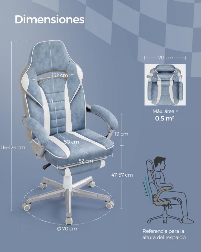 Dimensiones: Ajustables, con una altura de asiento de 47-57 cm y un respaldo de 71 cm de altura