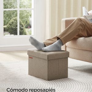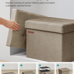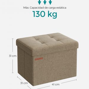 Con dimensiones de 31 x 41 x 31 cm y una capacidad total de 32 L, este puff plegable es perfecto para organizar tus sábanas, almohadas, mantas, revistas y mucho más, ayudándote a mantener tu espacio limpio y ordenado sin sacrificar estilo.