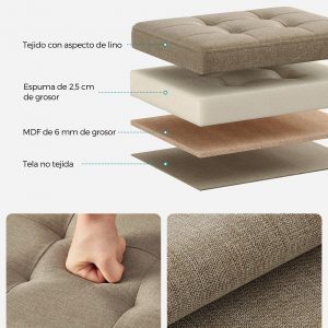 La comodidad es una prioridad en este banco de almacenamiento. Relleno de espuma de alta densidad y revestido con tela de aspecto de lino, proporciona un asiento suave, de apoyo y transpirable, garantizando una experiencia de asiento inigualable y una comodidad óptima para el uso diario.