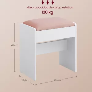 Sólido y estable: Construido con paneles de aglomerado robustos, este taburete soporta hasta 120 kg, garantizando un asiento fiable y seguro para tu rutina diaria de belleza. Las almohadillas antideslizantes evitan cualquier movimiento no deseado.