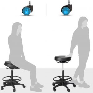 Estabilidad y Seguridad: Equipado con ruedas de PU robustas que se bloquean al sentarse, este taburete evita desplazamientos no deseados, permitiéndote concentrarte en tu trabajo sin preocupaciones. Además, las ruedas están diseñadas para ser amigables con todo tipo de suelos, incluidos los de madera, sin dejar marcas ni rasguños.