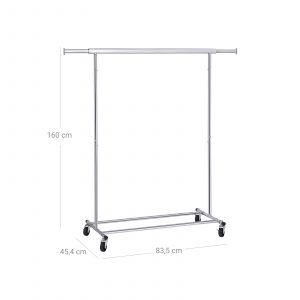 Este estante de ropa extensible está diseñado para soportar la carga de camisas, suéteres, chaquetas y abrigos largos. Los tubos planos garantizan un mayor contacto con los ganchos para ropa, asegurando una capacidad de carga máxima impresionante de 70 kg.