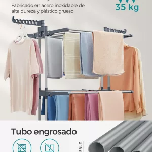 Gran Capacidad de Secado: Este tendedero cuenta con 4 niveles de secado y 2 alas giratorias con 14 orificios, lo que ofrece amplio espacio para colgar ropa, toallas, edredones, zapatos y calcetines. Tiene una capacidad de carga total de hasta 35 kg, permitiendo secar gran cantidad de prendas a la vez.
