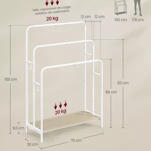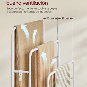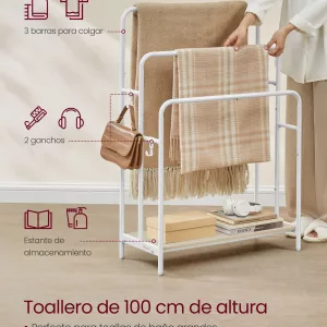 Espacioso y Práctico: Con una altura de 100 cm y tres barras, este estante permite colgar múltiples toallas y mantas grandes, manteniéndolas alejadas del suelo y protegidas de la suciedad.