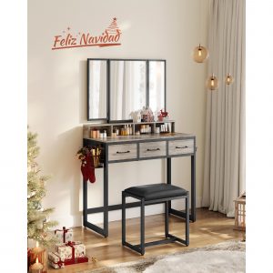 Un elegante tocador con espejo triple, fabricado en aglomerado y acero para máxima estabilidad, junto con un taburete acolchado para tu comodidad. ¡Prepárate para transformar tu rutina de belleza!