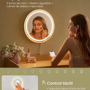 Espejo Iluminado: Incluye un elegante espejo redondo con luz ajustable. El control táctil permite cambiar entre luz natural, cálida y fría, garantizando que siempre tengas la iluminación perfecta para tu maquillaje y cuidados.
