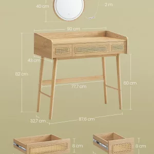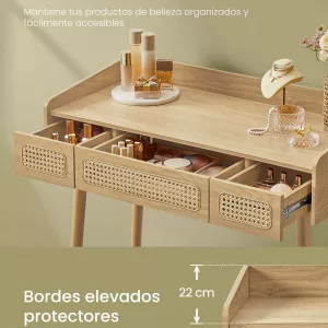 Estilo Boho: El tocador destaca por su estética bohemia, que añade un toque natural y elegante a tu espacio. Las patas de madera maciza y los elementos tejidos aportan calidez y personalidad a tu habitación.