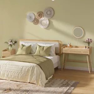 Transforma tu rutina de belleza con el Tocador Boho de la colección. Con su diseño que combina tonos naturales, patas de madera maciza y elementos tejidos, este tocador crea un ambiente sereno y acogedor, ideal para mimar tu mente y tu cuerpo.