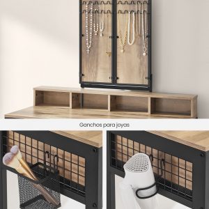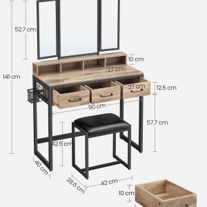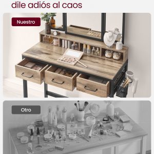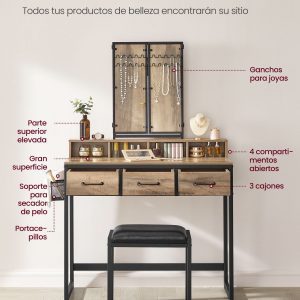 Un elegante tocador con espejo triple, fabricado en aglomerado y acero para máxima estabilidad, junto con un taburete acolchado para tu comodidad. ¡Prepárate para transformar tu rutina de belleza!