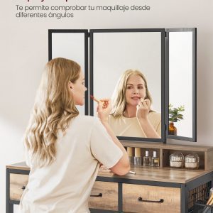 El tocador con espejo triple claro y práctico permite evaluar tu maquillaje desde distintos ángulos. ¡Plega los lados para obtener una vista panorámica mientras creas peinados espectaculares con total precisión!
