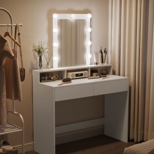 Múltiples Espacios de Almacenamiento: Ofrece un estante elevado para perfumes, 3 compartimentos abiertos para pintalabios, 2 cajones espaciosos para secadores y planchas de pelo, y una encimera grande para organizar y almacenar tus productos de belleza.
