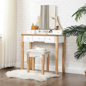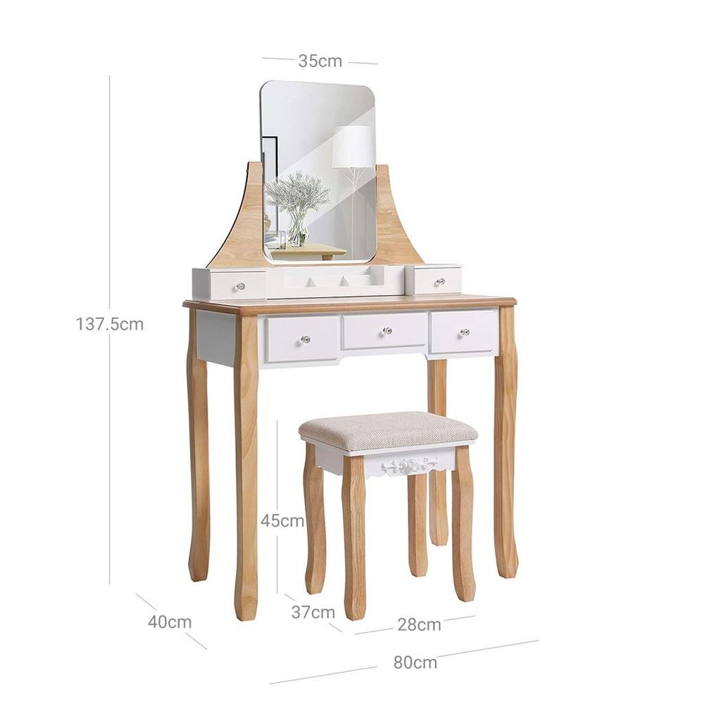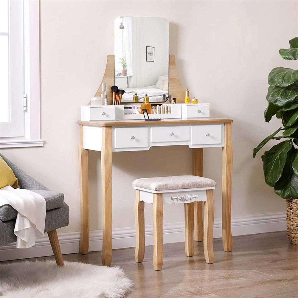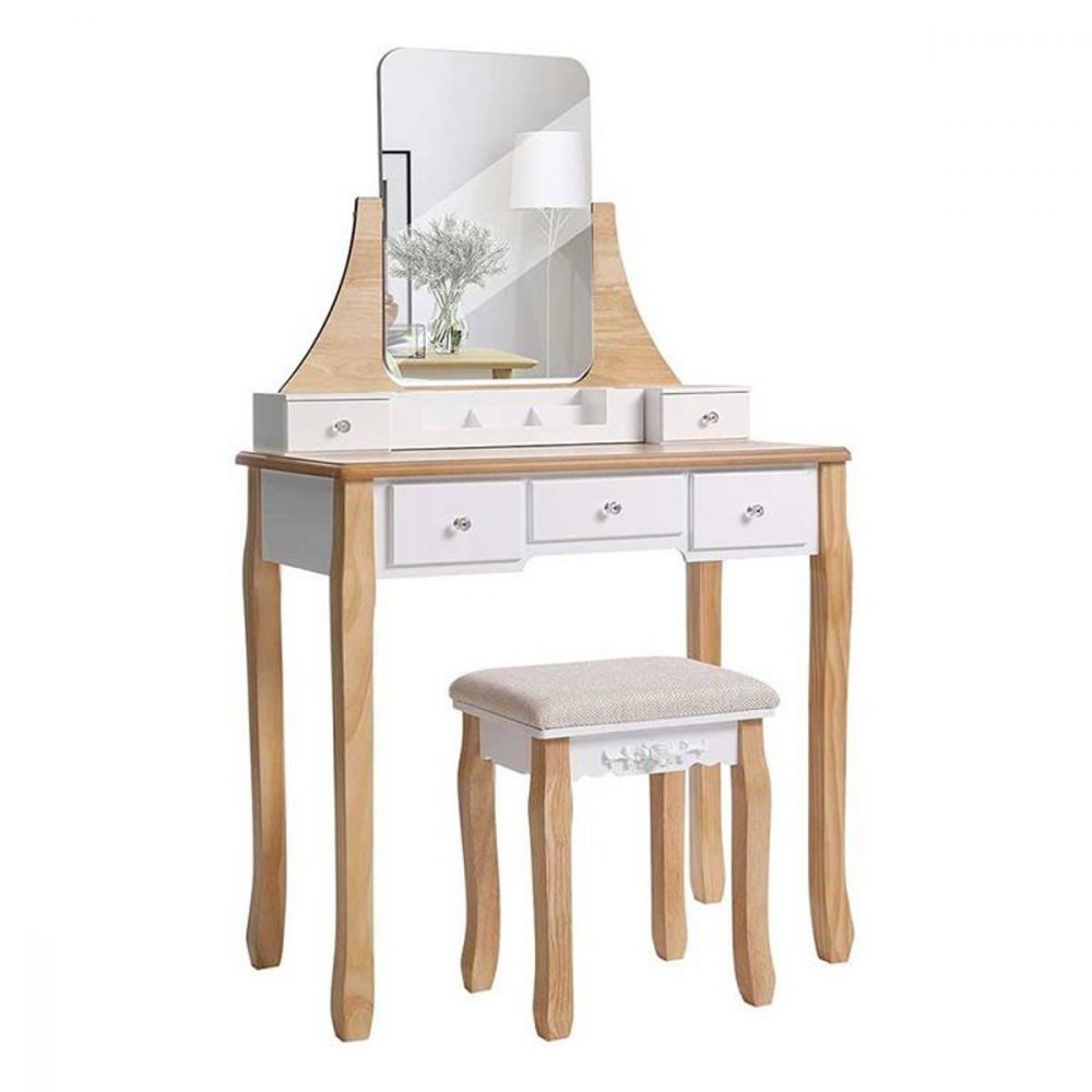 Tocador con taburete y espejo giratorio, 5 cajones, madera