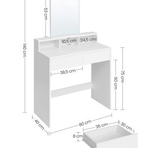 Descubre la combinación perfecta de funcionalidad y ahorro de espacio. Este tocador, equipado con 2 cajones, 1 amplio estante y 3 compartimentos abiertos, ofrece un generoso espacio para organizar todos tus productos de belleza, convirtiéndolo en la elección ideal para espacios reducidos.