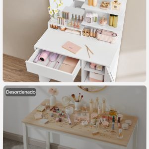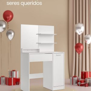 El diseño minimalista, las líneas limpias y el sofisticado color blanco se fusionan en este elegante escritorio de maquillaje, mejorando la estética de tu dormitorio. Un toque de modernidad y funcionalidad que realza la belleza de tu espacio personal.