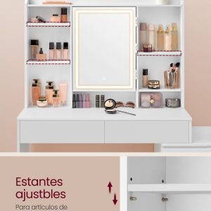 Los estantes ajustables del tocador te permiten organizar productos de diferentes tamaños, desde botellas altas de cuidado de la piel hasta compactos de maquillaje.