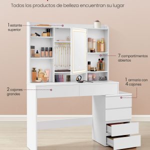 Con 1 estante superior, 7 compartimentos abiertos, 2 cajones grandes, ganchos detrás del espejo y una cajonera con 4 cajones, tendrás un lugar específico para cada uno de tus productos de belleza, asegurando que todo esté siempre a mano.