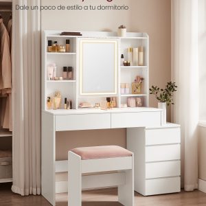 Transforma tu rutina de belleza con esta estación de maquillaje espaciosa y elegante. Diseñada para ofrecer una solución integral de almacenamiento y maquillaje, este tocador incorpora múltiples compartimentos y detalles inteligentes para satisfacer todas tus necesidades.