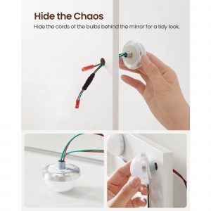 Los cables de luces están ocultos detrás del espejo en lugar de expuestos para un aspecto más atractivo.