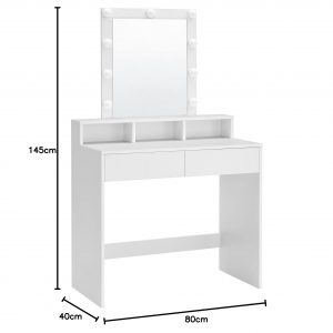 1 estante elevado para perfumes, 3 compartimentos abiertos para pintalabios, 2 cajones espaciosos para secadores y planchas de pelo, y 1 encimera grande. Este tocador ofrece varios espacios para guardar tus cosas de belleza.