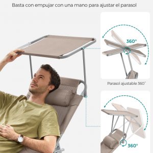Sombrilla Ajustable: Incluye una sombrilla regulable que puedes ajustar fácilmente con la mano para bloquear el sol y leer o relajarte sin deslumbrarte. La sombra adicional permite una experiencia más cómoda bajo el sol.