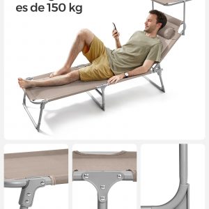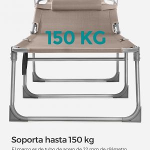 Estabilidad y Durabilidad: Su marco de acero con recubrimiento de polvo y juntas reforzadas soportan hasta 150 kg. Los pies antideslizantes proporcionan mayor estabilidad, asegurando que la tumbona se mantenga firme en todo momento.
