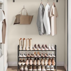 Optimización de la Organización de Zapatos: Los postes telescópicos permiten expandir el zapatero horizontalmente, mientras que el estante inferior elevado aumenta el espacio de almacenamiento vertical.
