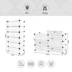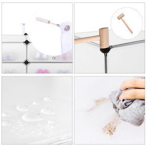 La integridad estructural de nuestro armario se asegura mediante paneles de plástico PP, que encajan perfectamente en conectores de plástico ABS robustos y un marco de metal resistente. Cada estante tiene la capacidad de soportar hasta 10 kg, garantizando un almacenamiento seguro. Además, el dispositivo de fijación incluido promete una estabilidad adicional, para tu tranquilidad.