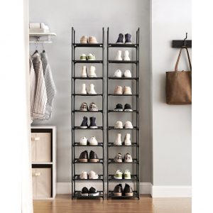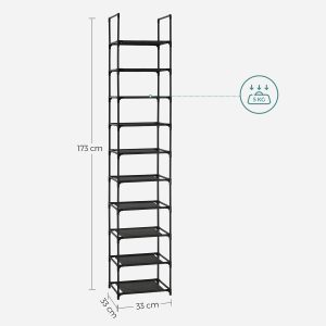Zapatero vertical 10 estantes, diseño estrecho, metal y tela, negro